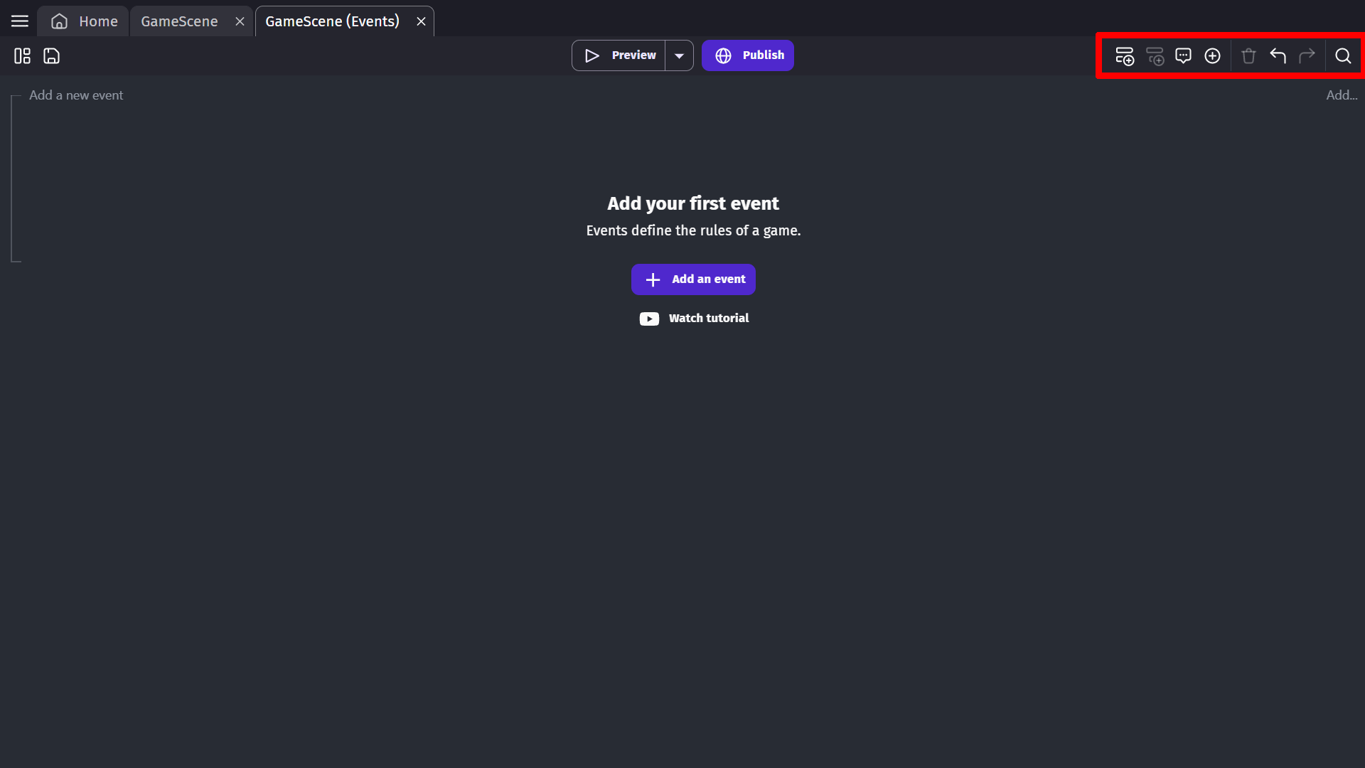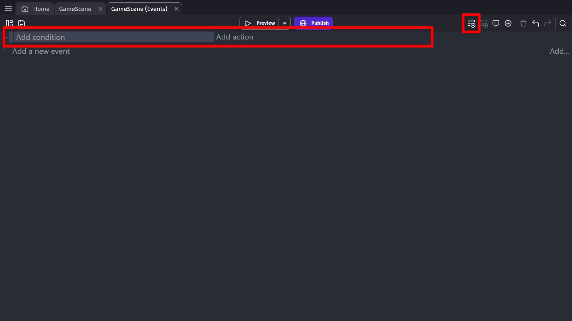 When you switch to the Events editor, you will see that the toolbar changes to display new tools: