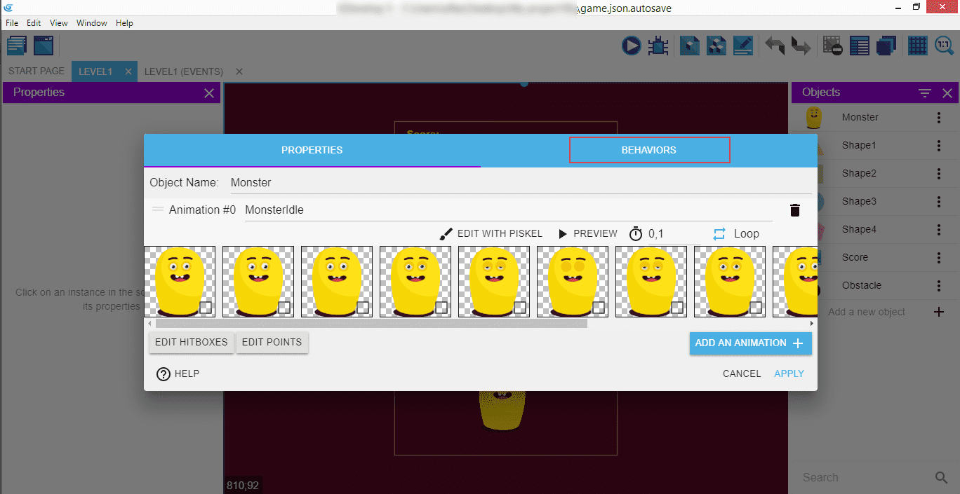 Click on the "Level1" to go back to the scene editor, then in the right panel with the "Objects" double click on the "Monster" - it will open a popup.