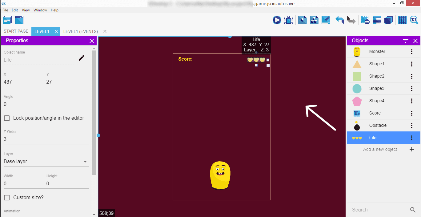 Drag and drop the "Life" object onto the scene and place it in the top right corner. We'll see during next chapter how to animate this "Life" object, making a "game over" screen when it reaches zero.