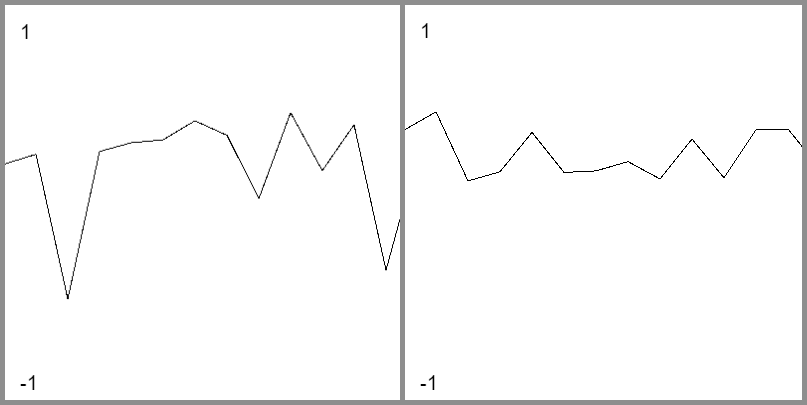 The graph on the left shows a random number being placed between -1 and 1. On the right is a graph using noise to generate the values. Notice how the noise values smoothly change from the high points to the low points, unlike the random function where one value could be high and the next very low leading to a very uneven transition. This is the benefit of noise functions: they can create random, but consistent looking results.