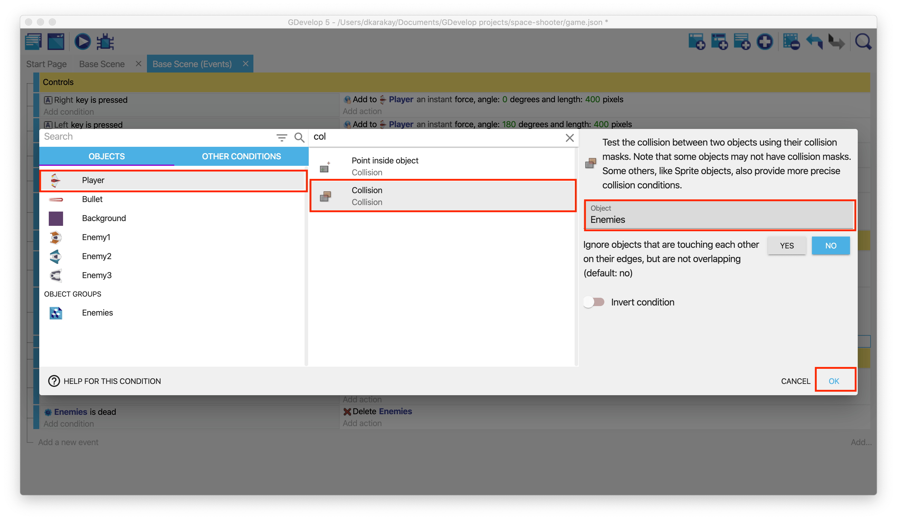 We will add a few actions to shoot the enemies. Firstly, open the Events tab. Then, add a new condition, choose the Enemies object group that we created before. Select action as Collision and the object as Bullet; by doing that, we can track the collision between our bullet objects and the enemies.